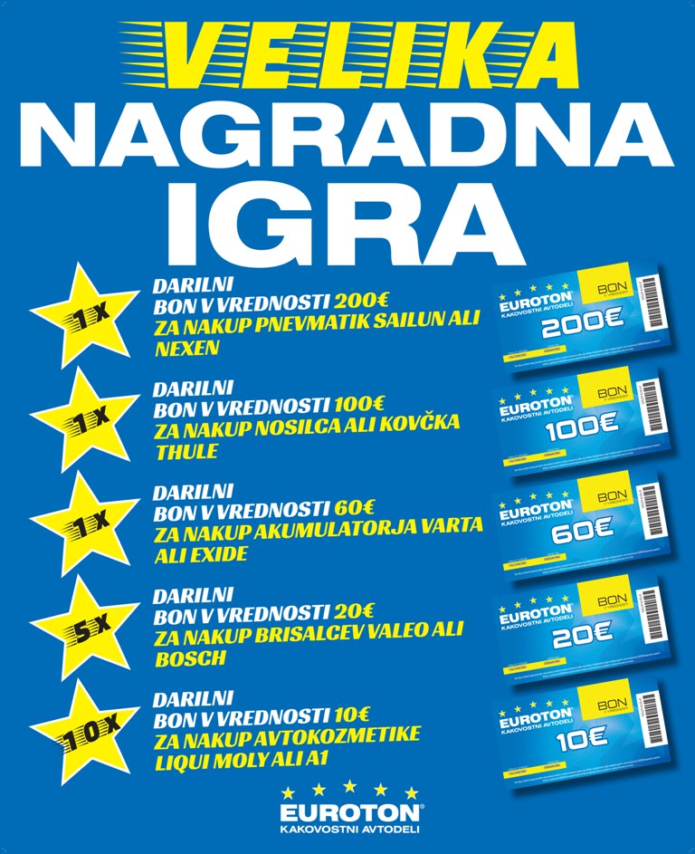 – 3. nagrada: darilni bon v vrednosti 60 € za nakup akumulatorja Varta ali Exide,